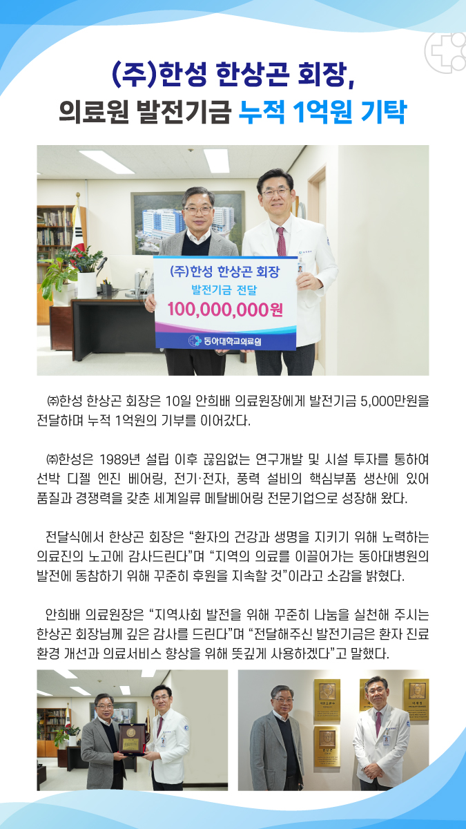 ㈜한성 한상곤 회장, 의료원 발전기금 누적 1억원 기탁