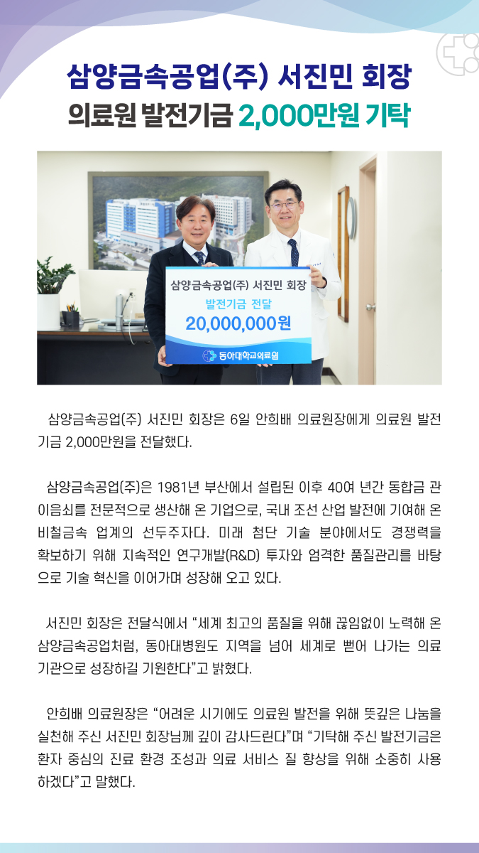 삼양금속공업(주) 서진민 회장, 의료원 발전기금 2,000만원 기탁