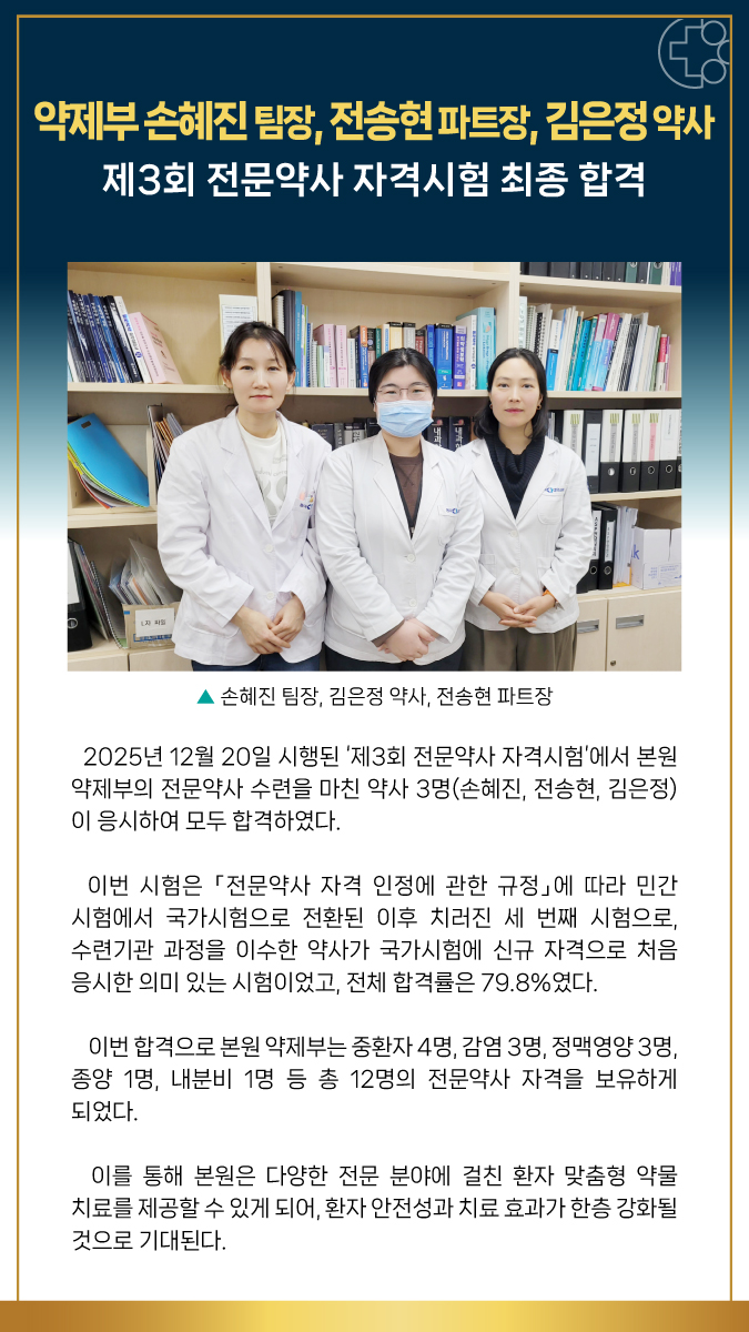 약제부 손혜진 팀장, 전송현 파트장, 김은정 약사 _제3회 전문약사 자격시험 최종 합격