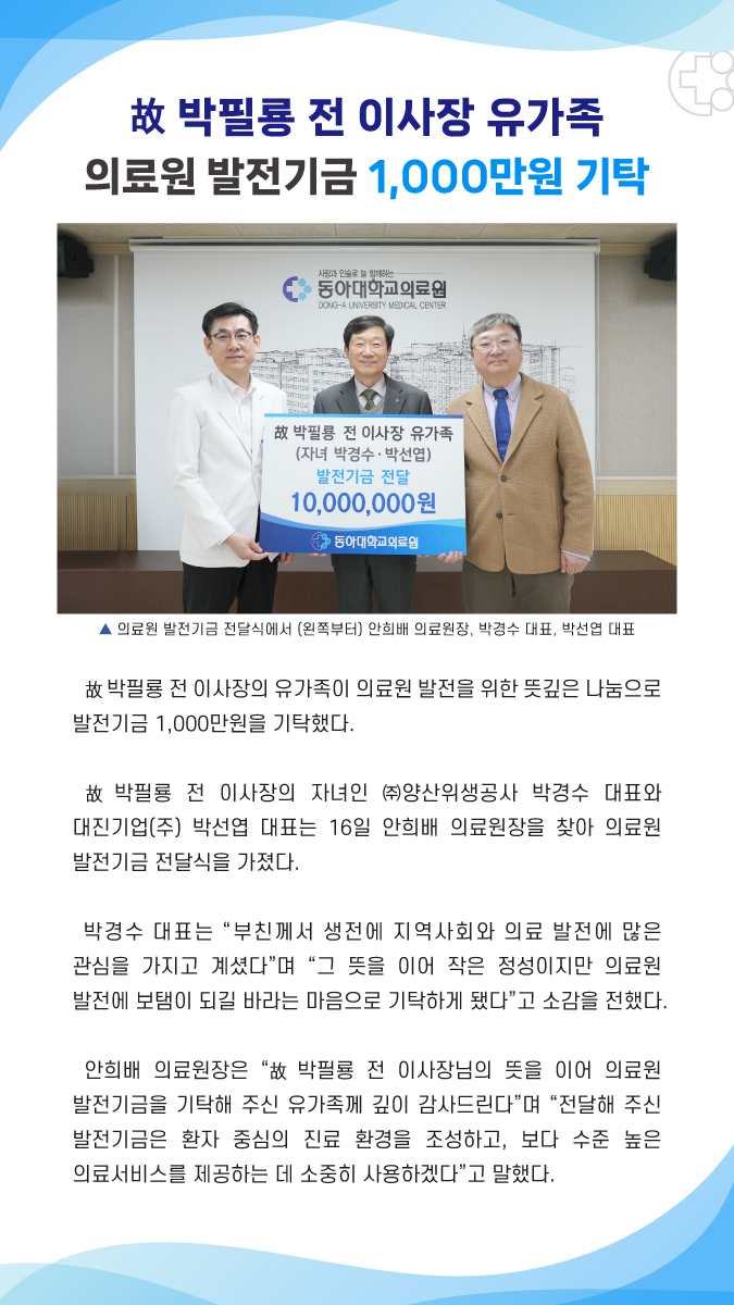 故 박필룡 전 이사장 유가족, 의료원 발전기금 1,000만원 기탁