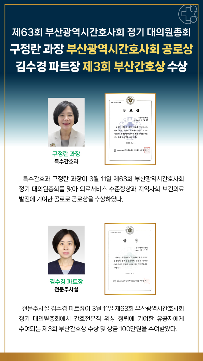 부산광역시간호사회 구정란 과장 공로상, 김수경 파트장 부산간호상 수상